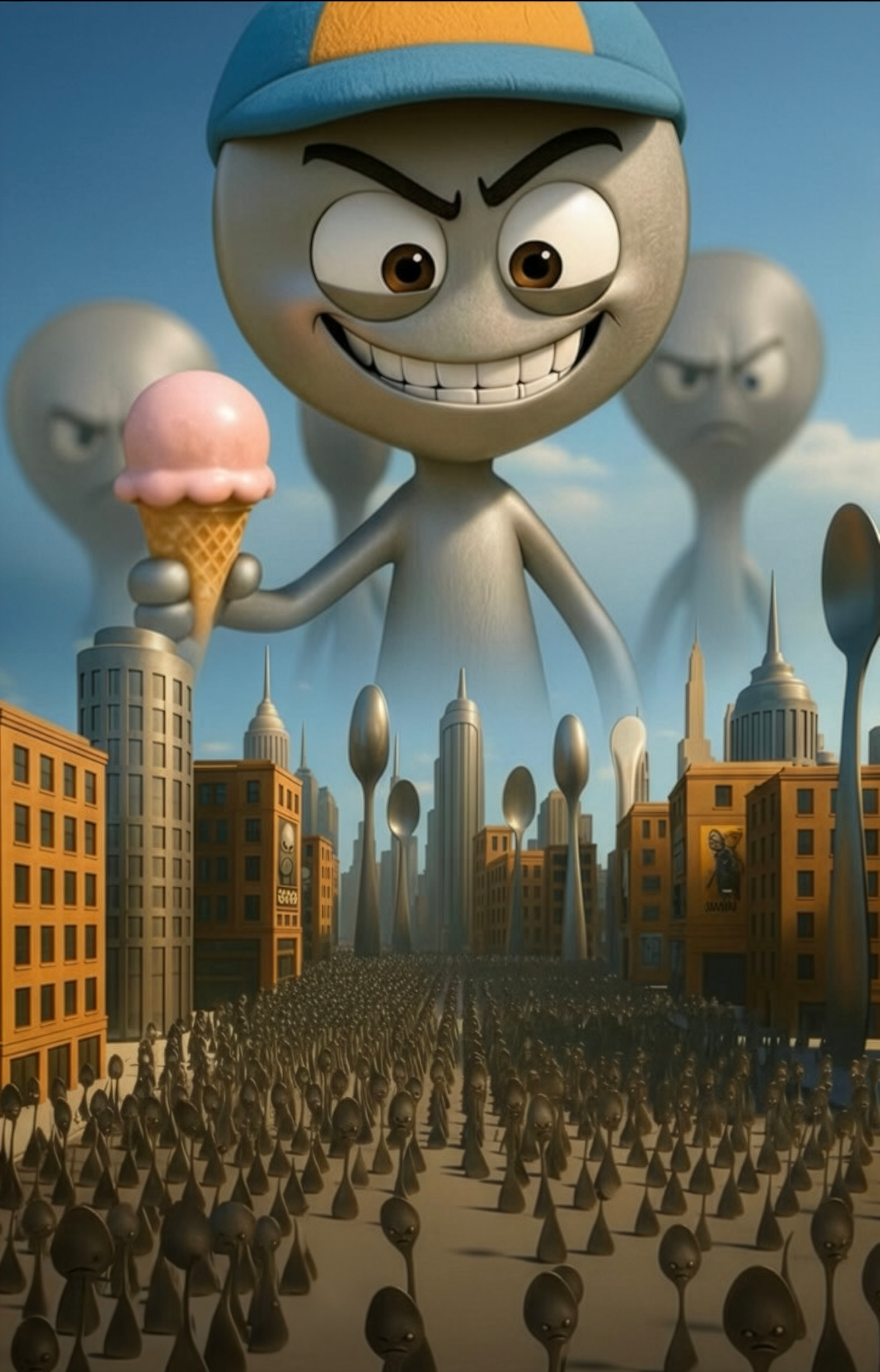 Ilustración de una ciudad con edificios en tonos anaranjados y una multitud de seres pequeños y oscuros en las calles, con un gigante con una gorra azul y amarilla que sostiene un helado de fresa en una mano y una sonrisa malvada en el fondo, mostrando un escenario futurista y surrealista.
